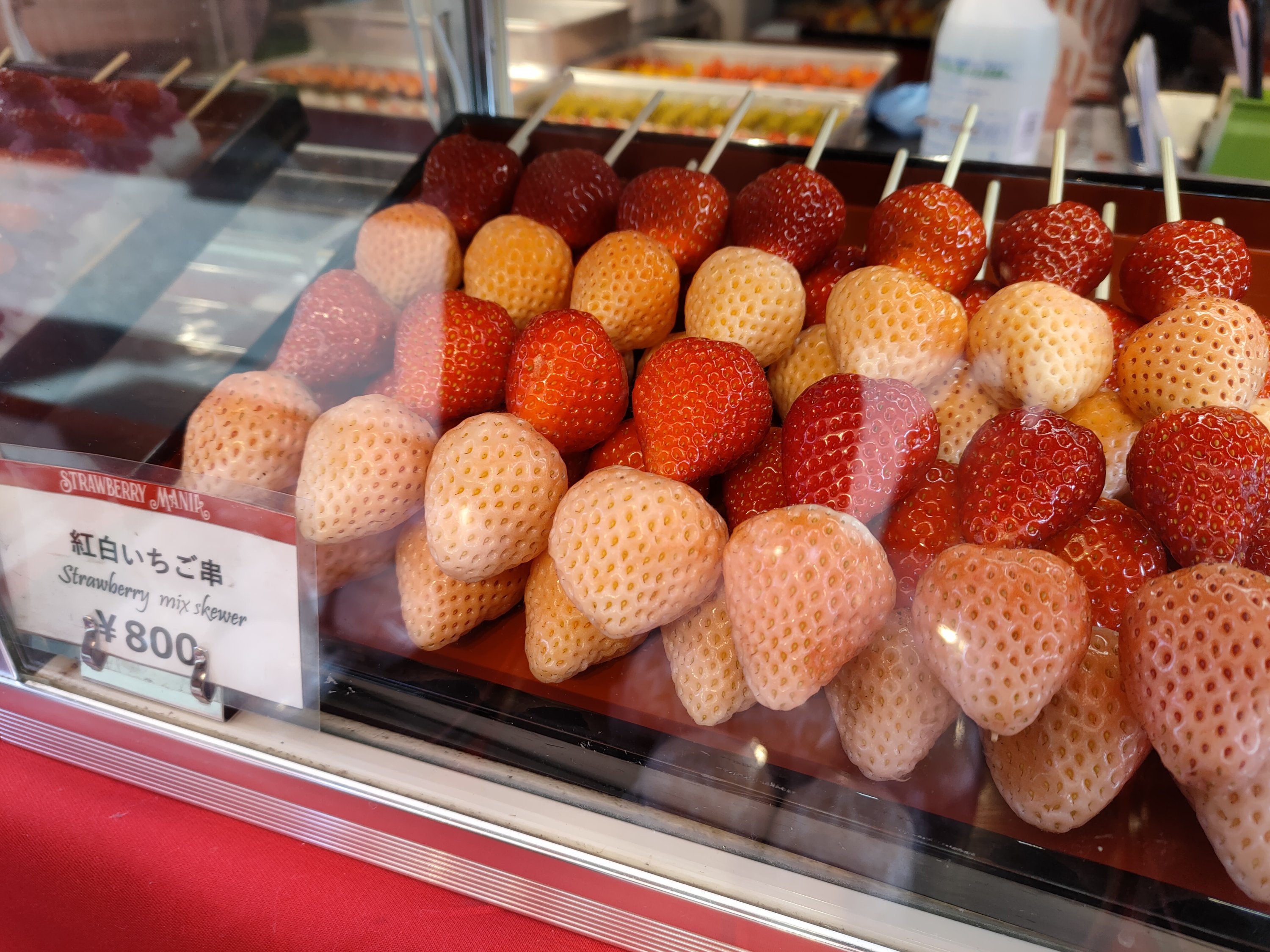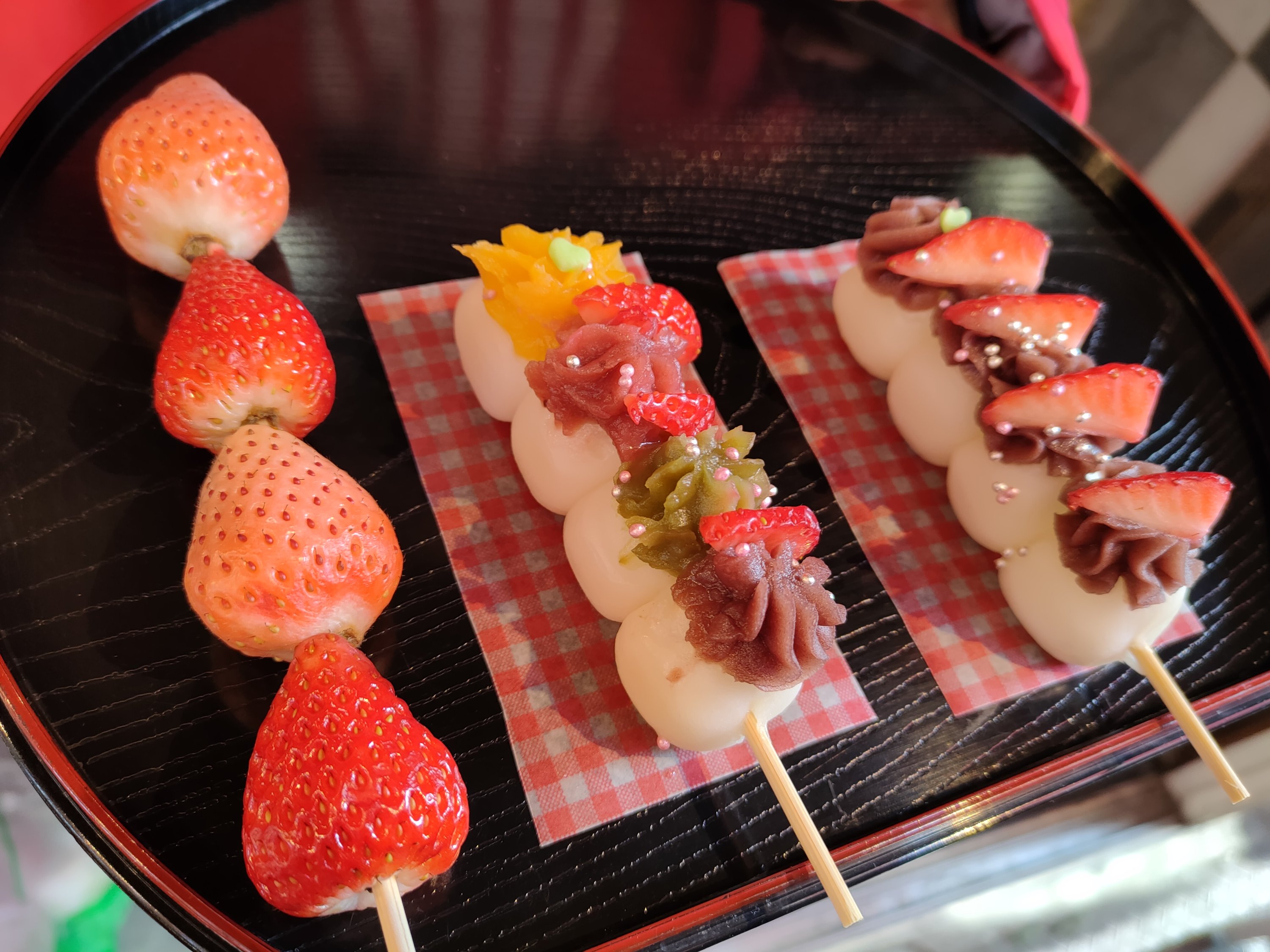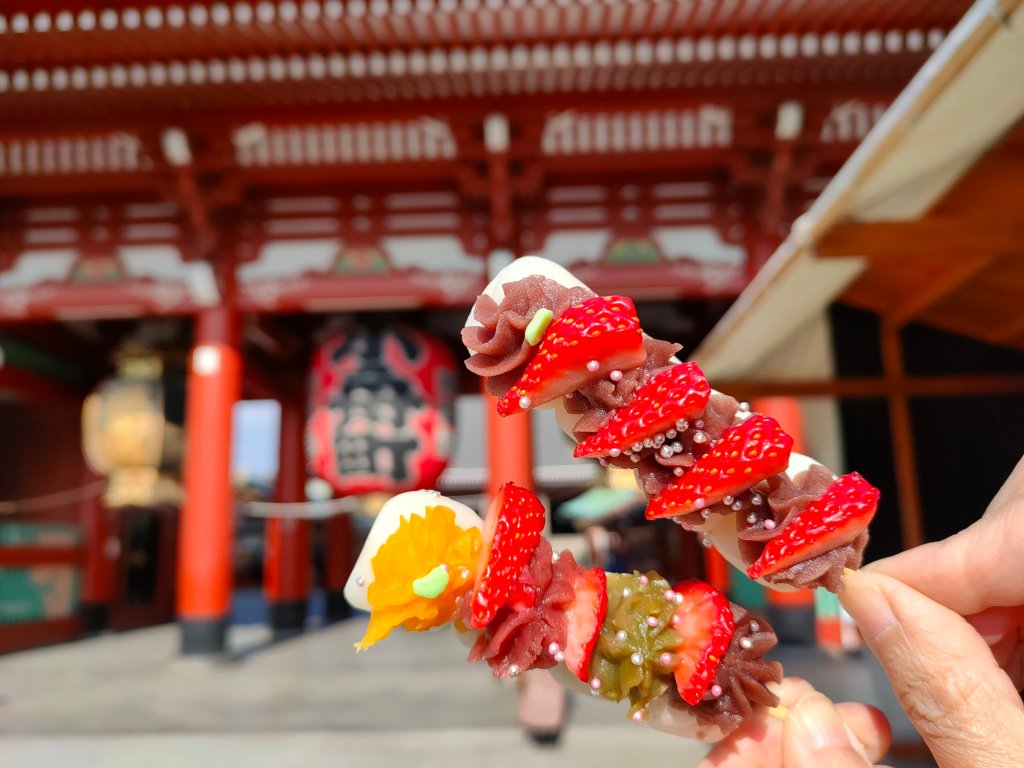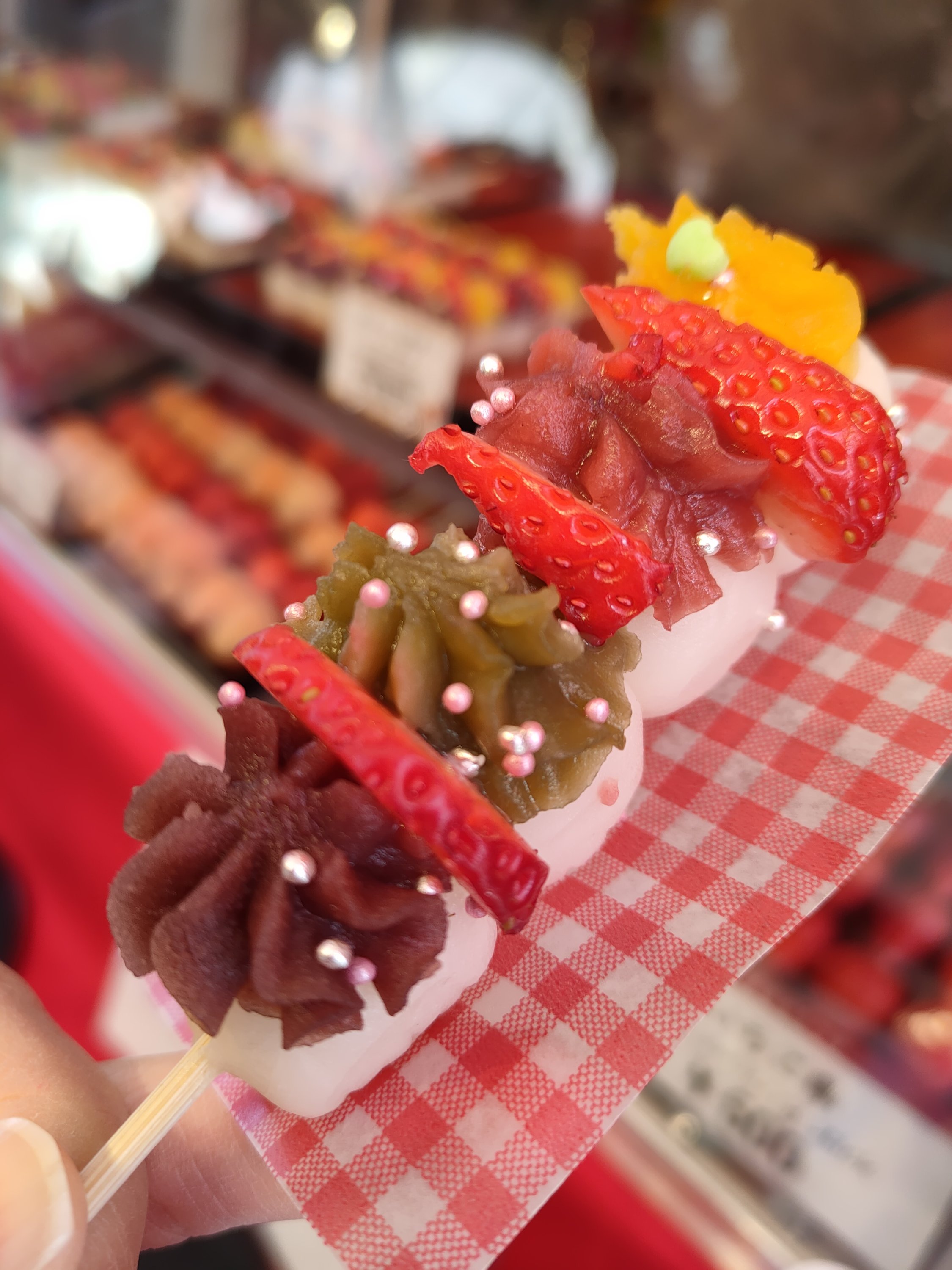 ดังโงะ ไดฟุกุ และผลไม้เสียบไม้ร้านนี้น่ารัก สีสันสวยงาม ร้านอยู่เลียบกับถนนนากามิเสะ ด้านขวามือจากทางเข้าประตูคามินาริมง